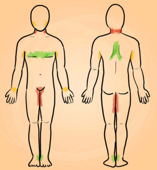 A simplified diagram of where the major and secondary glands are located. Even when separated into this two groups there are significant differences in the pheromone discharge.The areas in red have the highest pheromone discharge and generally present mild swelling during a cycle.The areas in yellow have a significant pheromone discharge, but present no swelling.The areas in green have the lowest pheromone discharge. However, the chest area glands do get swollen for omegas after birth, and produce additional pheromones to calm their offspring.