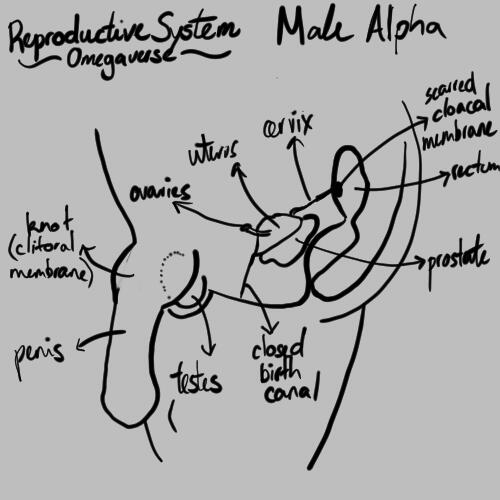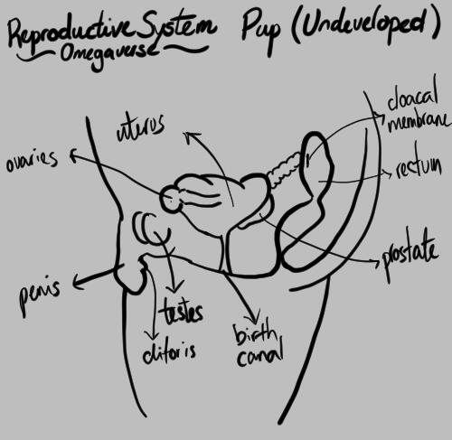 Much like an omega’s, their hips and partial-cloacal opening may be narrower. During their development from pups, their prostate and seminal ducts did not close off completely and therefore their semen is still produced with sperm. Therefore similar to an alpha (or male beta) these omegas may in theory be able to get sire pups. Depending on that reproductive system’s level of development.However, due to the limited space in their uterus, it is unlikely that this omega variant can carry to term.
